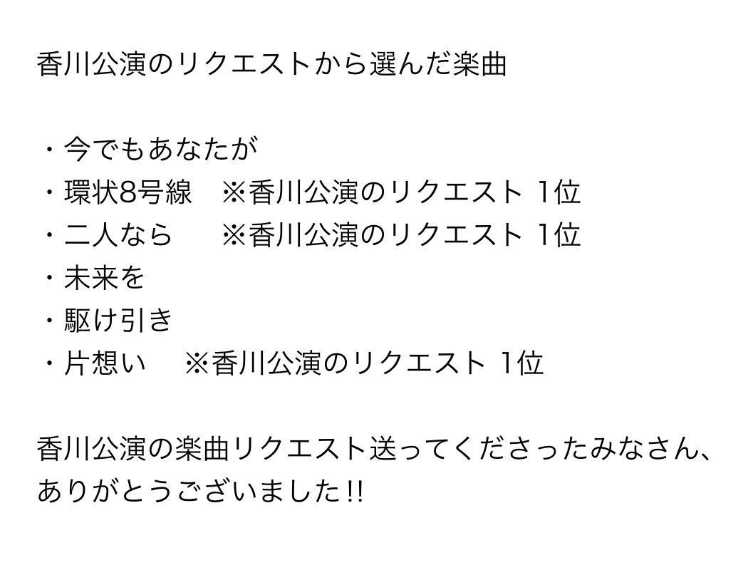 今回は、みなさんからの各会場リクエストも参考に香川公演ならではのセットリストを考えました。47ツアーは続くのでセトリは公開しませんが、みなさんからのリクエストで選曲した楽曲は公開しますね🎹